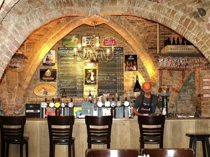 For those who prefer to enjoy their beer in a truly atmospheric setting, Le Trappiste is an essential stop in Bruges. Located beneath a historic 13th-century cellar near the Markt, this vaulted underground bar offers one of the most unique beer experiences in the city. The stone arches, candlelit tables, and cool cellar air create an intimate environment that feels both medieval and timeless.